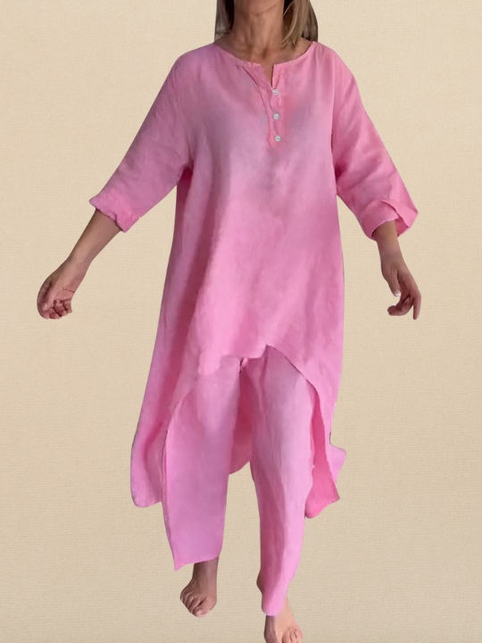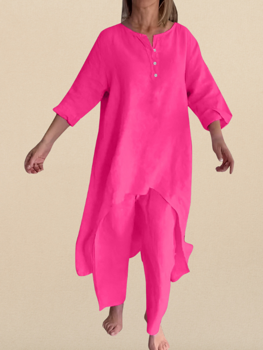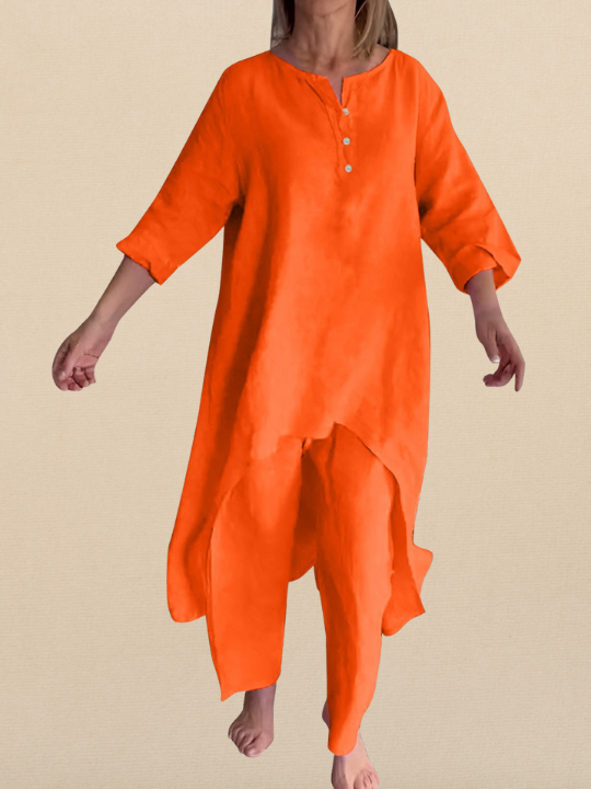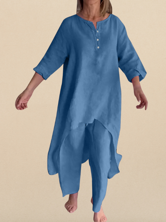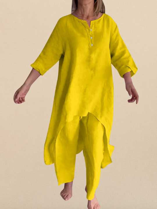 Ten dwuczęściowy komplet składa się z długiego topu i luźnych spodni z długim rękawem, idealnych na ciepłe dni. Z guzikiem na swetrze i lekkim, elastycznym T-shircie, to doskonały wybór na letnie, casualowe stylizacje.